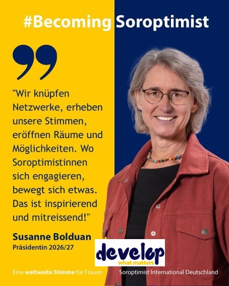 Ein herzliches Willkommen für unsere neue Präsidentin – seit 1.1.2026 leitet Susanne Bolduan das höchste Gremium von SI Deutschland, der größten Union von Soroptimist Europe. Seit Jahren ist sie eine engagierte Soroptimistin und war nicht nur Gründungsmitglied ihres SI Clubs Lauterbach. Sondern in vielen Ämtern für die soroptimistische Gemeinschaft aktiv vor allem als Vizepräsidentin von SI Deutschland von 2021 – 2023 und zuletzt als Schriftführerin für unsere Past President Manuela Nitsche. Von daher gesehen ist Susanne für ihr neues Amt bestens gerüstet.